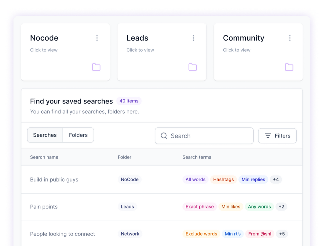 Save your searches & group into folders & use anytime with just a click. Edit & delete anytime.